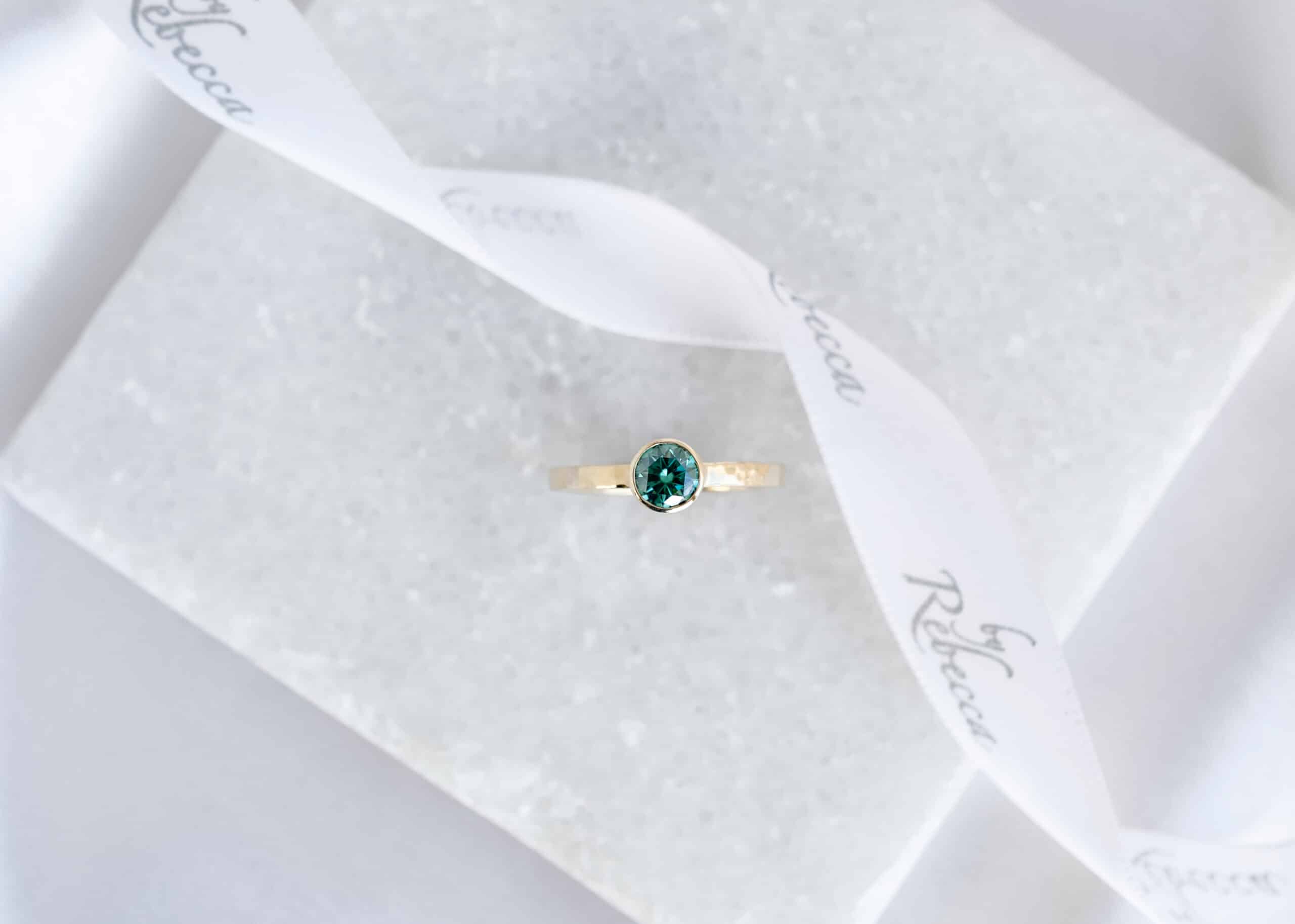This is a gorgeous ring with a stunning 6mm Green Moissanite Round Stone – Full of depth and sparkle and hand made by us for you in full solid 9ct yellow gold.