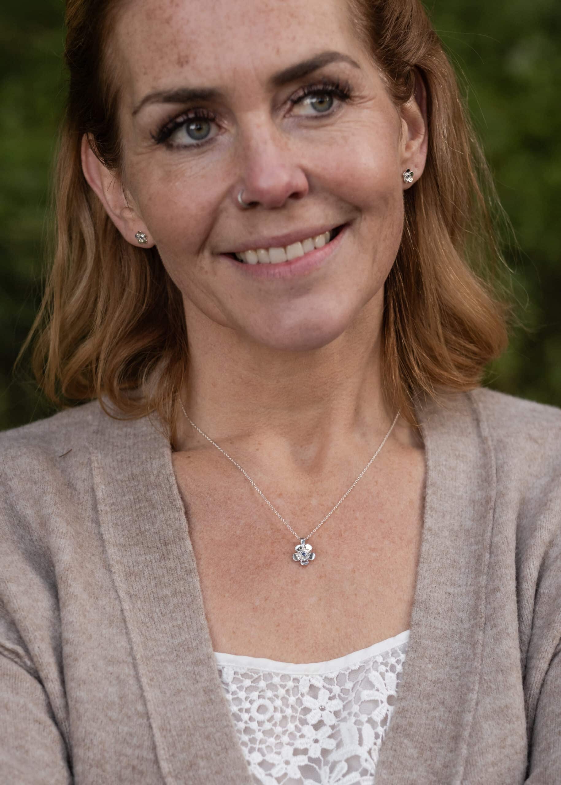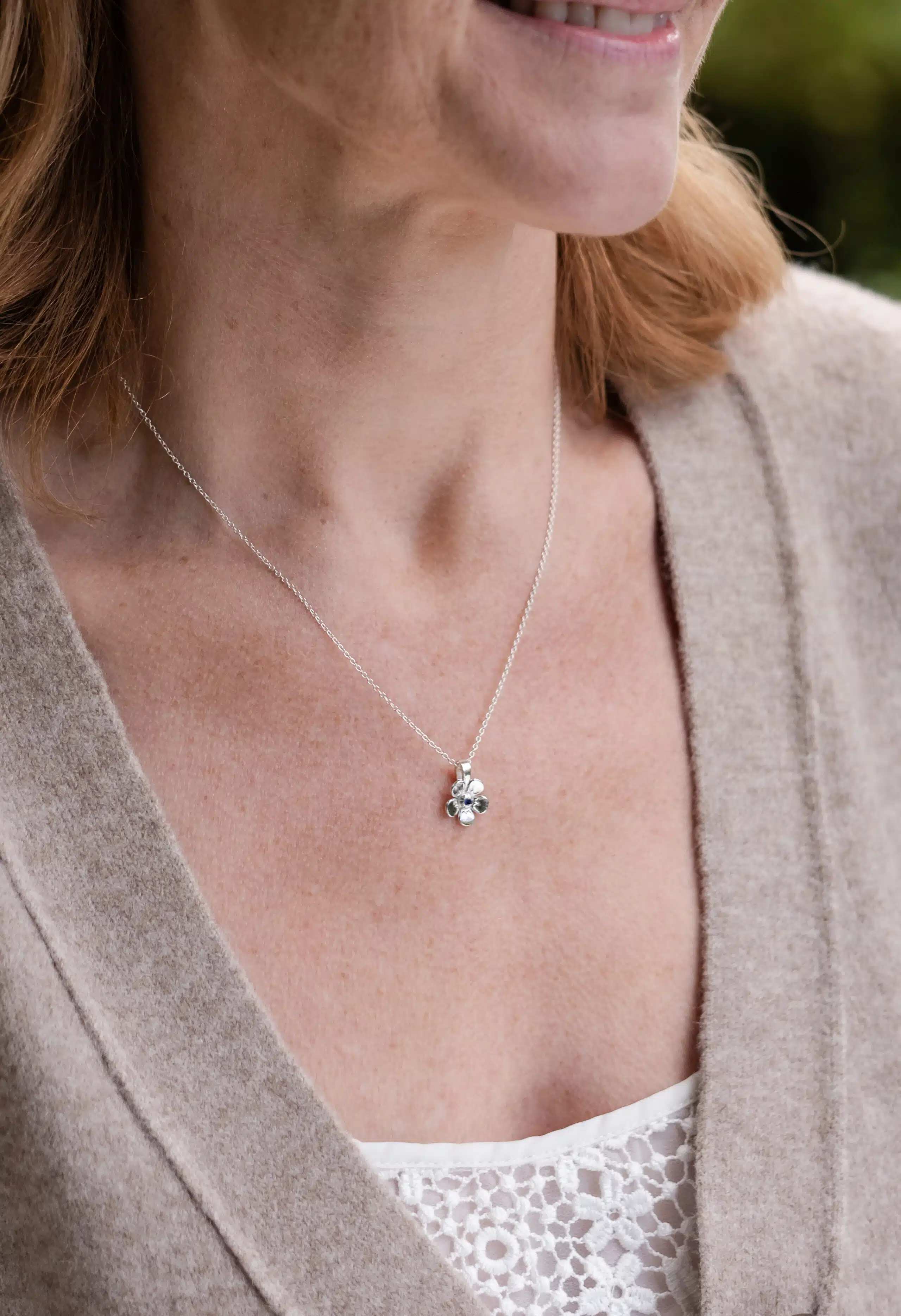 Handcrafted in sterling silver or 9ct yellow gold, each flower is delicately formed at 10mm and finished with a sparkling blue stone at its centre — echoing the heart of the bloom. The necklace holds a 2mm stone, while the matching studs carry a 1.5mm stone, a subtle shimmer to catch the light as you move.