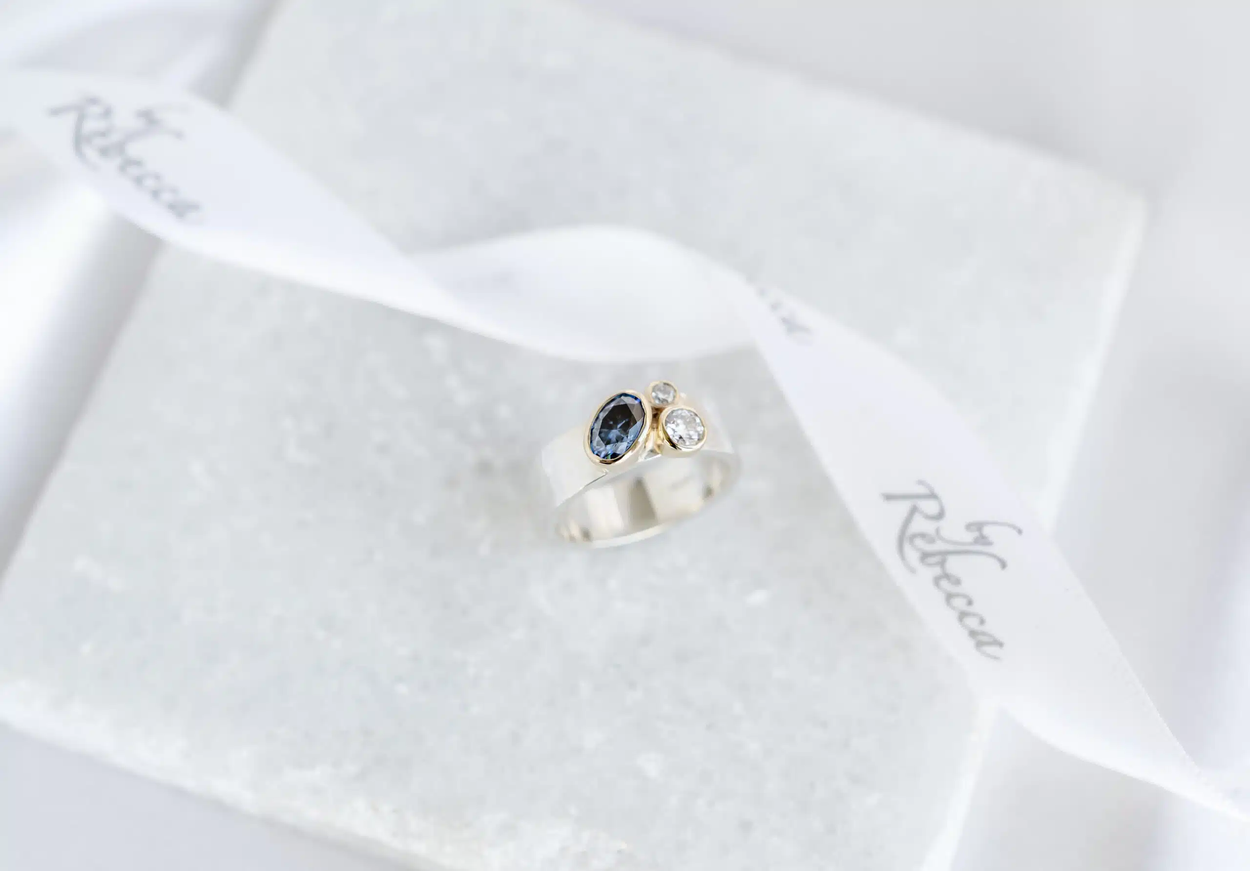 Others are about coming into alignment.At the heart of this one of a kind piece sits an oval blue moissanite, steady and grounding, its deep ocean tone shifting gently with the light. Beside it, two clear moissanites – gather like points of clarity, reflecting brightness and possibility. Set in warm 9ct yellow gold rub over settings against a silver band, the stones sit closely together, almost in conversation. Separate, yet connected. Distinct, yet harmonious.