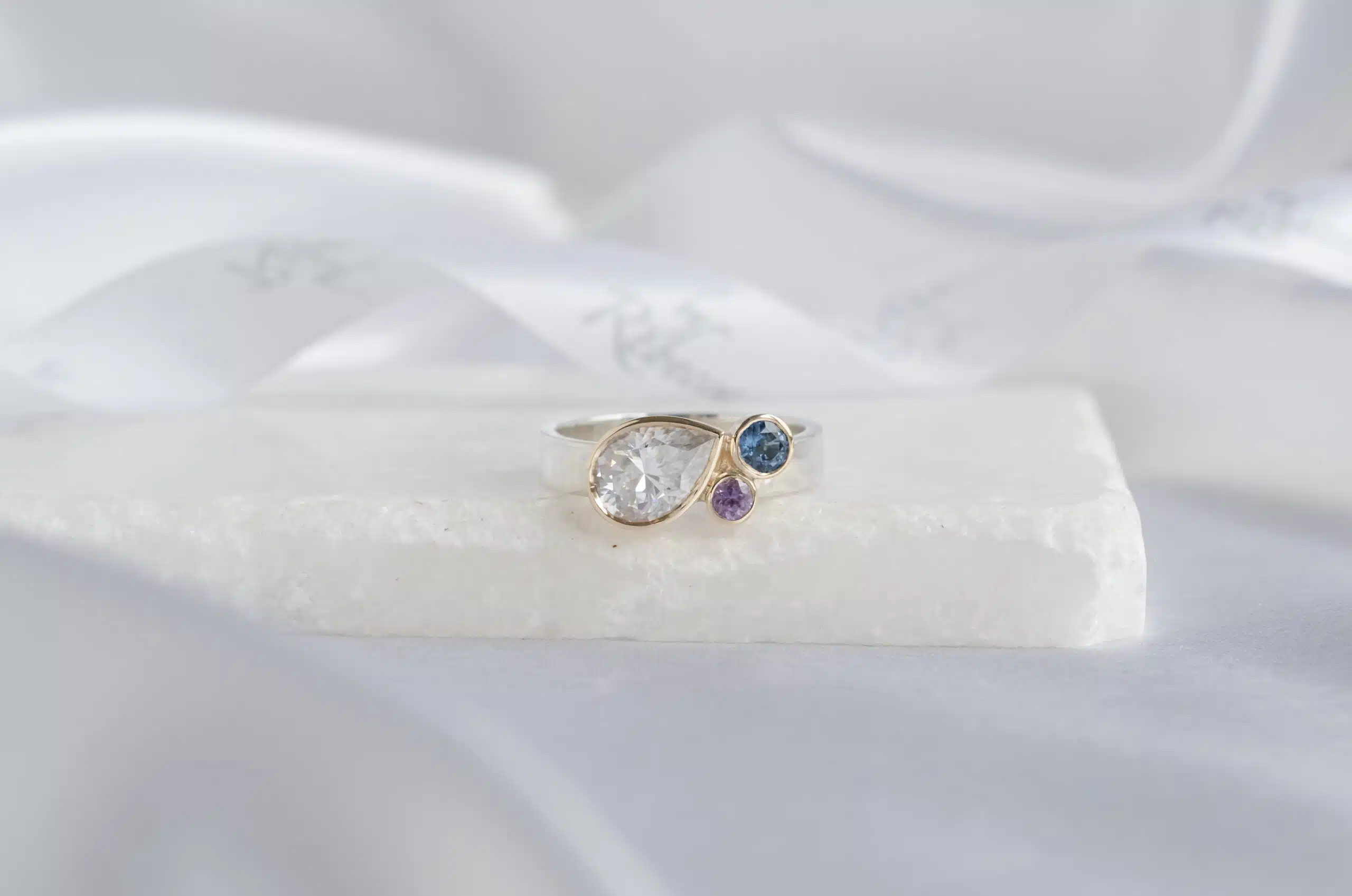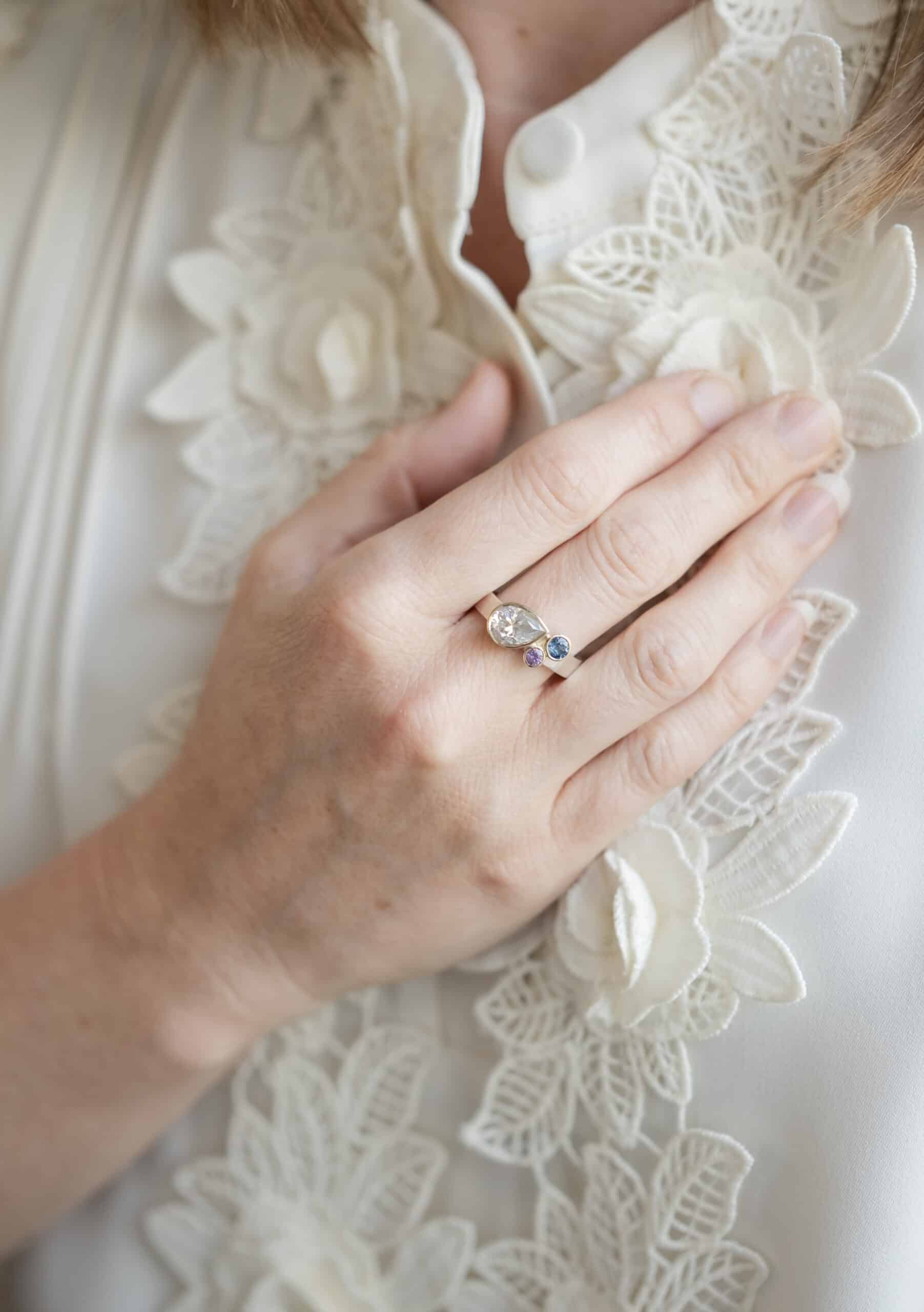 Celestia is a ring that speaks to the soul — a radiant celebration of inner strength, clarity, and cosmic wonder. Designed as a one-of-a-kind piece, this striking ring brings together a shimmering pear-shaped moissanite (7x10mm), a deep London blue topaz (4mm), and a rich purple amethyst (3mm), each stone symbolising purpose, truth, and intuition.