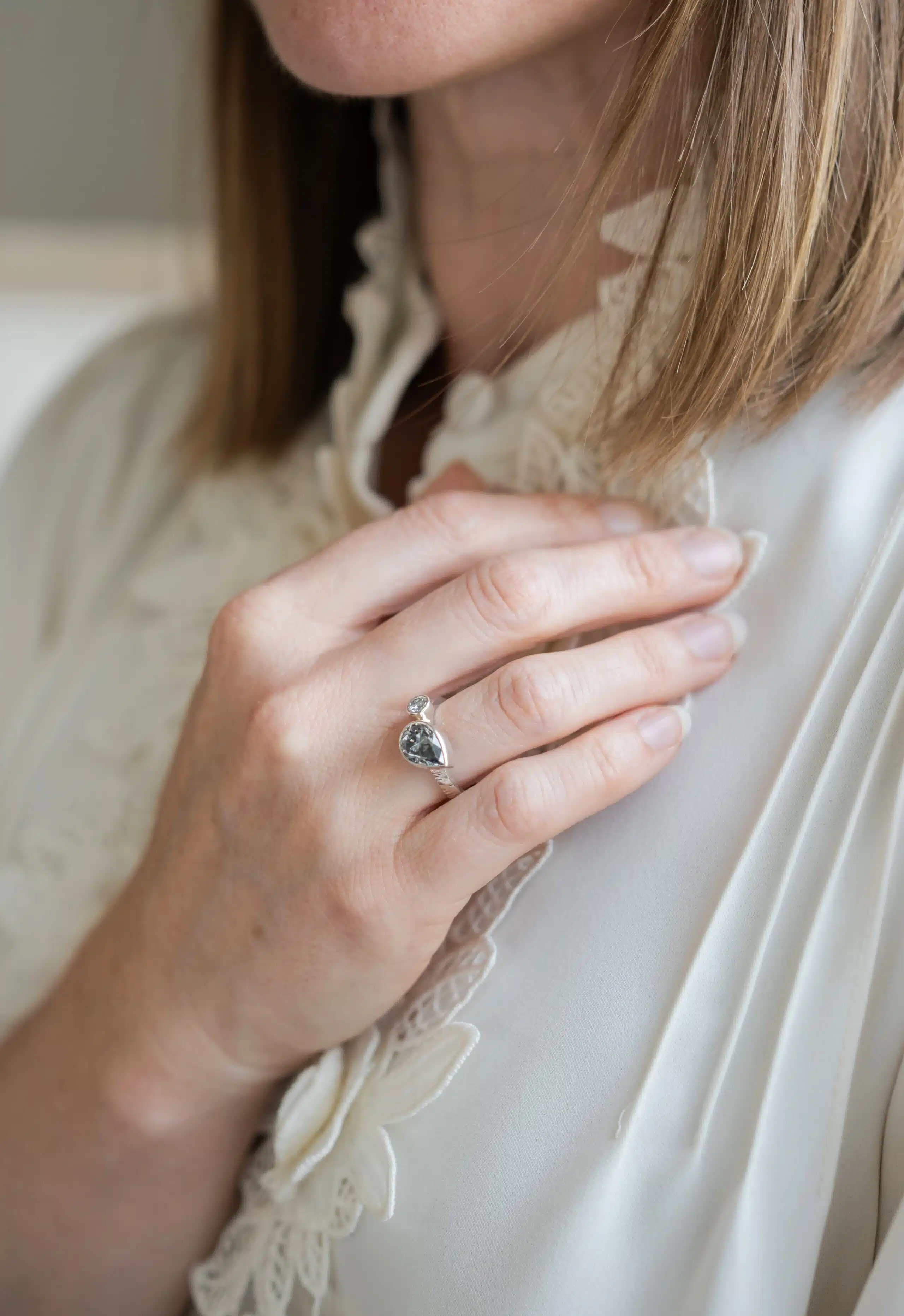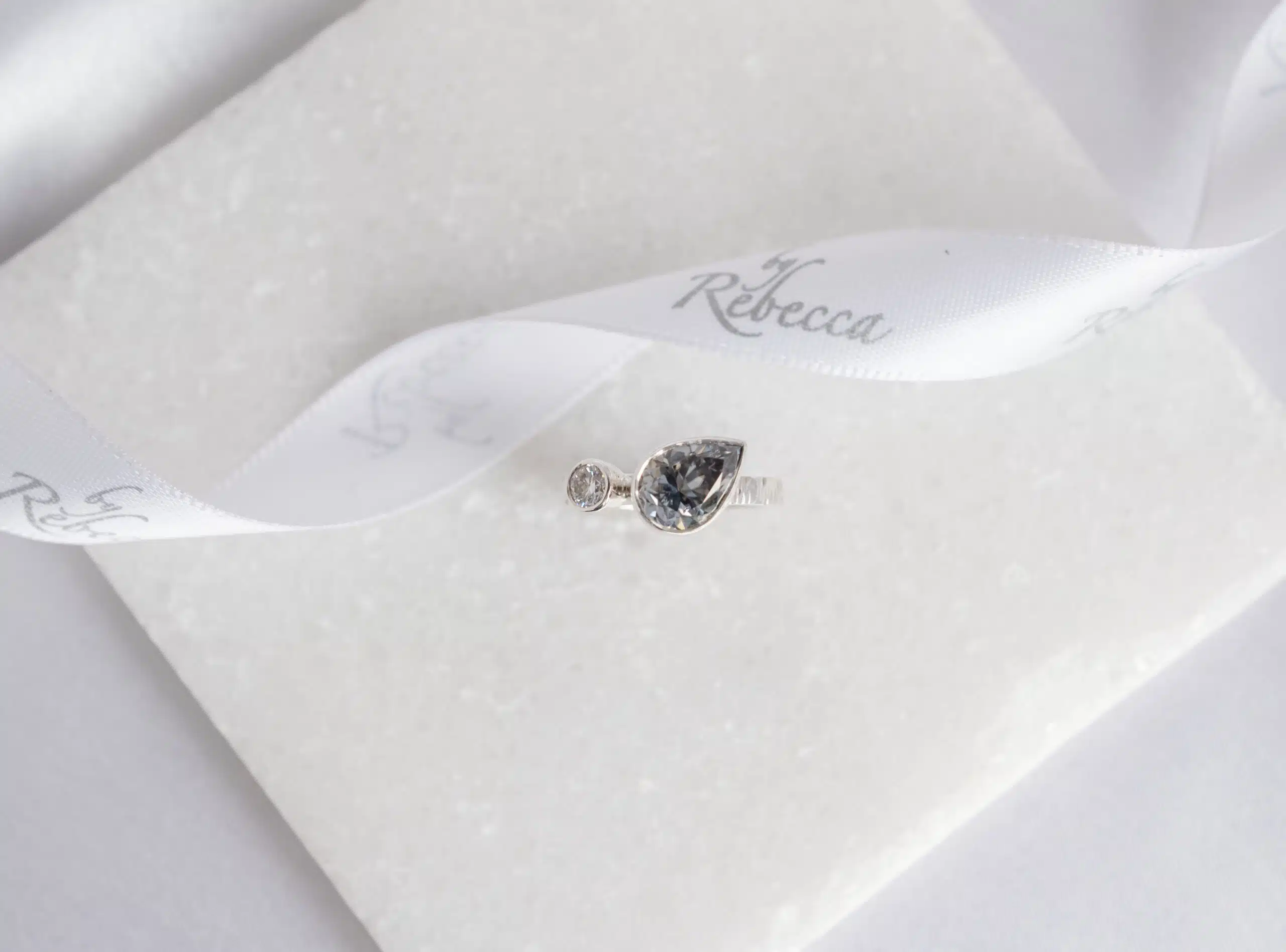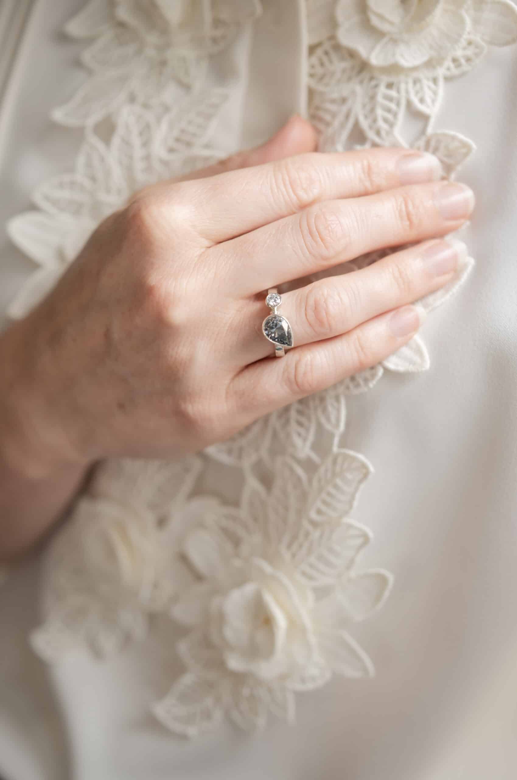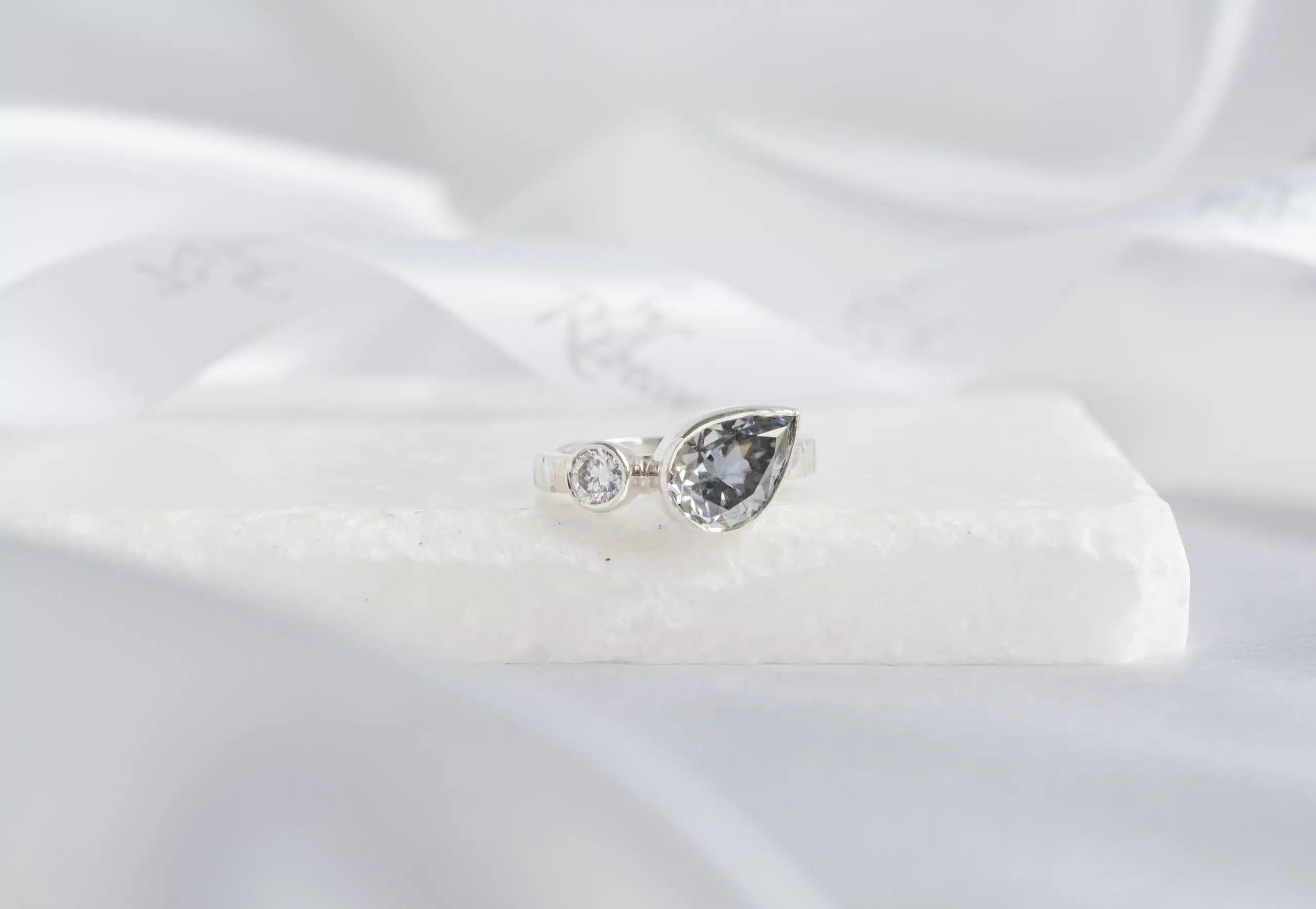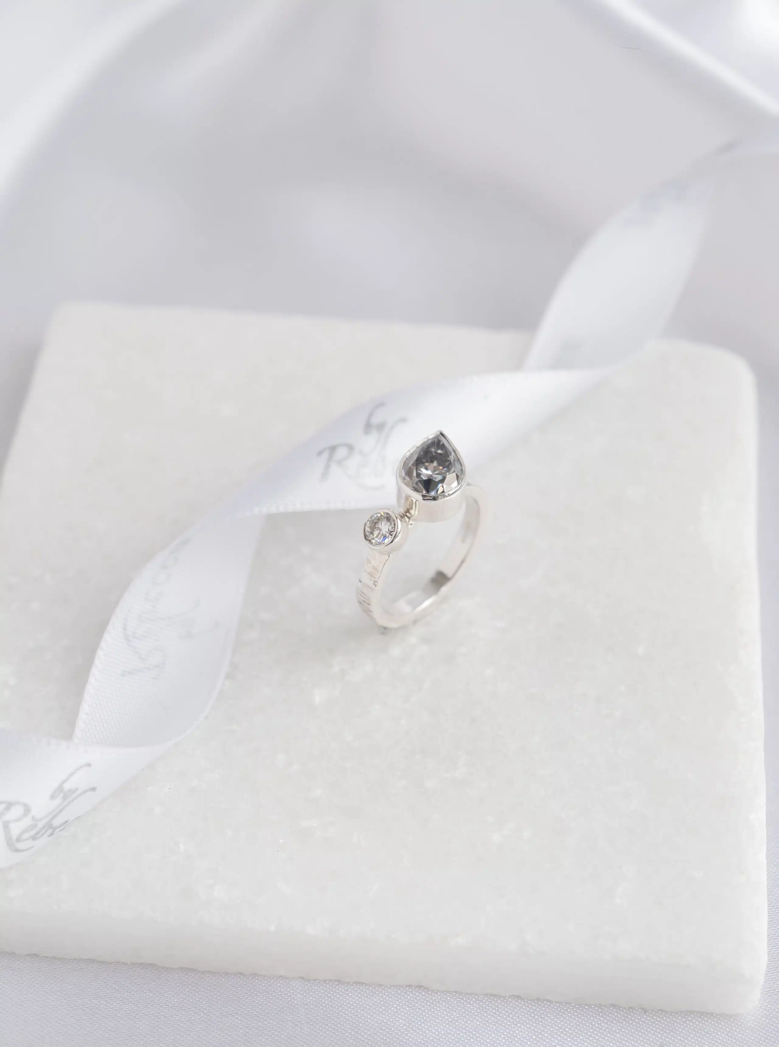 Delicate yet daring, Lumen is a ring that honours clarity, calm, and the quiet strength of presence. With a shimmering 7x10mm pear-cut moissanite paired beside a crisp 4mm round moissanite, this design evokes a sense of movement and balance — like moonlight dancing on still water.