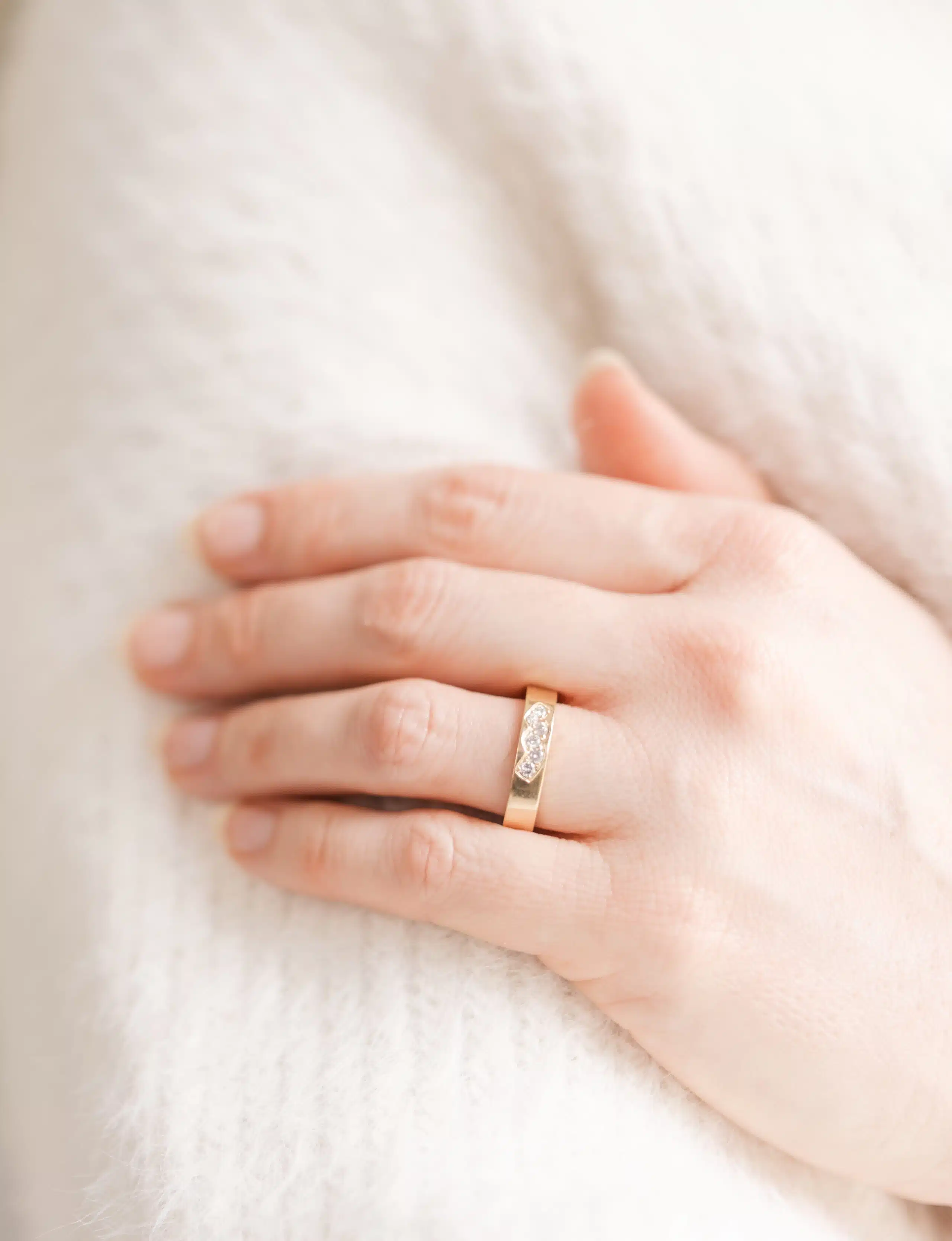 9ct yellow solid gold band with 6 pave set diamonds across the front in a lovely undulating pattern.