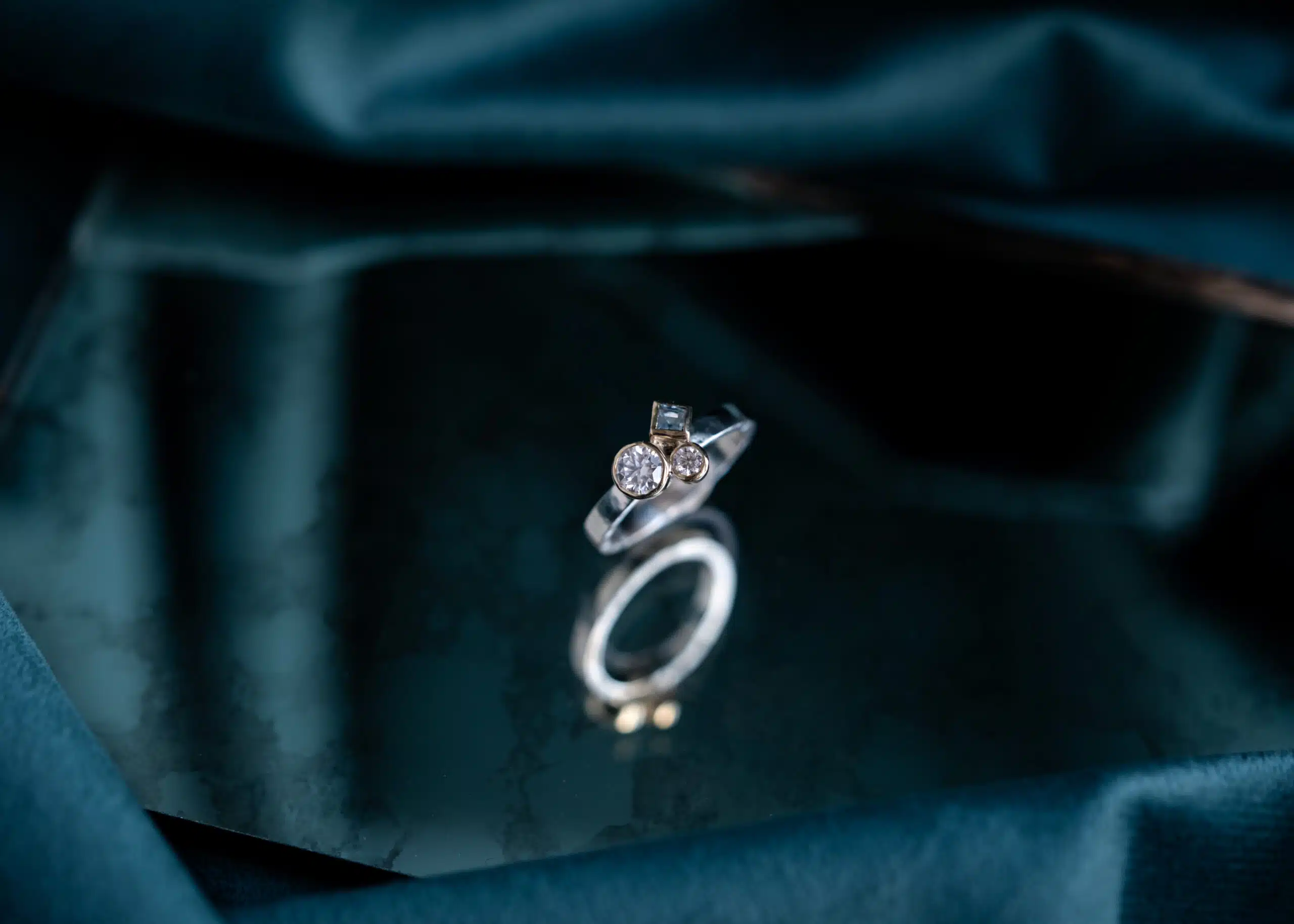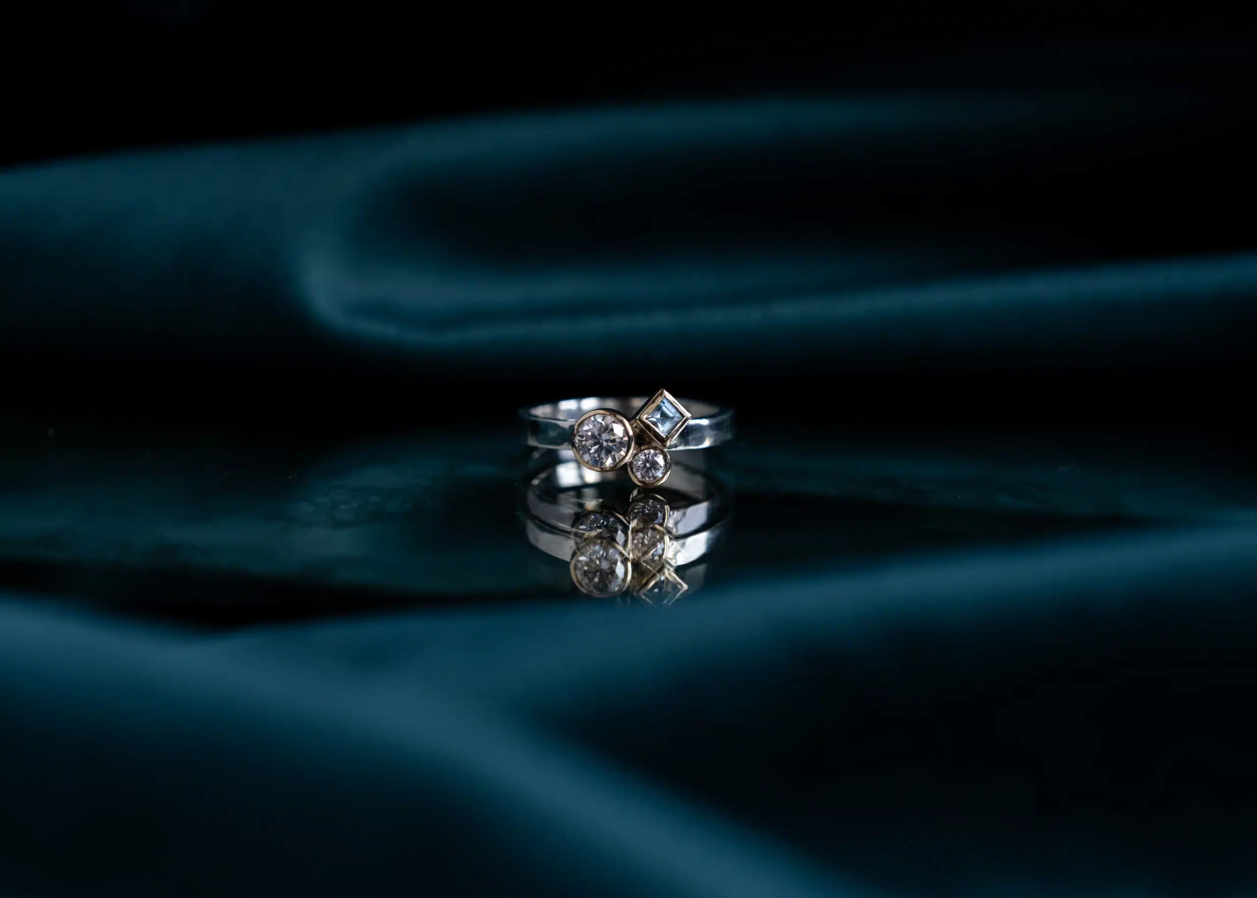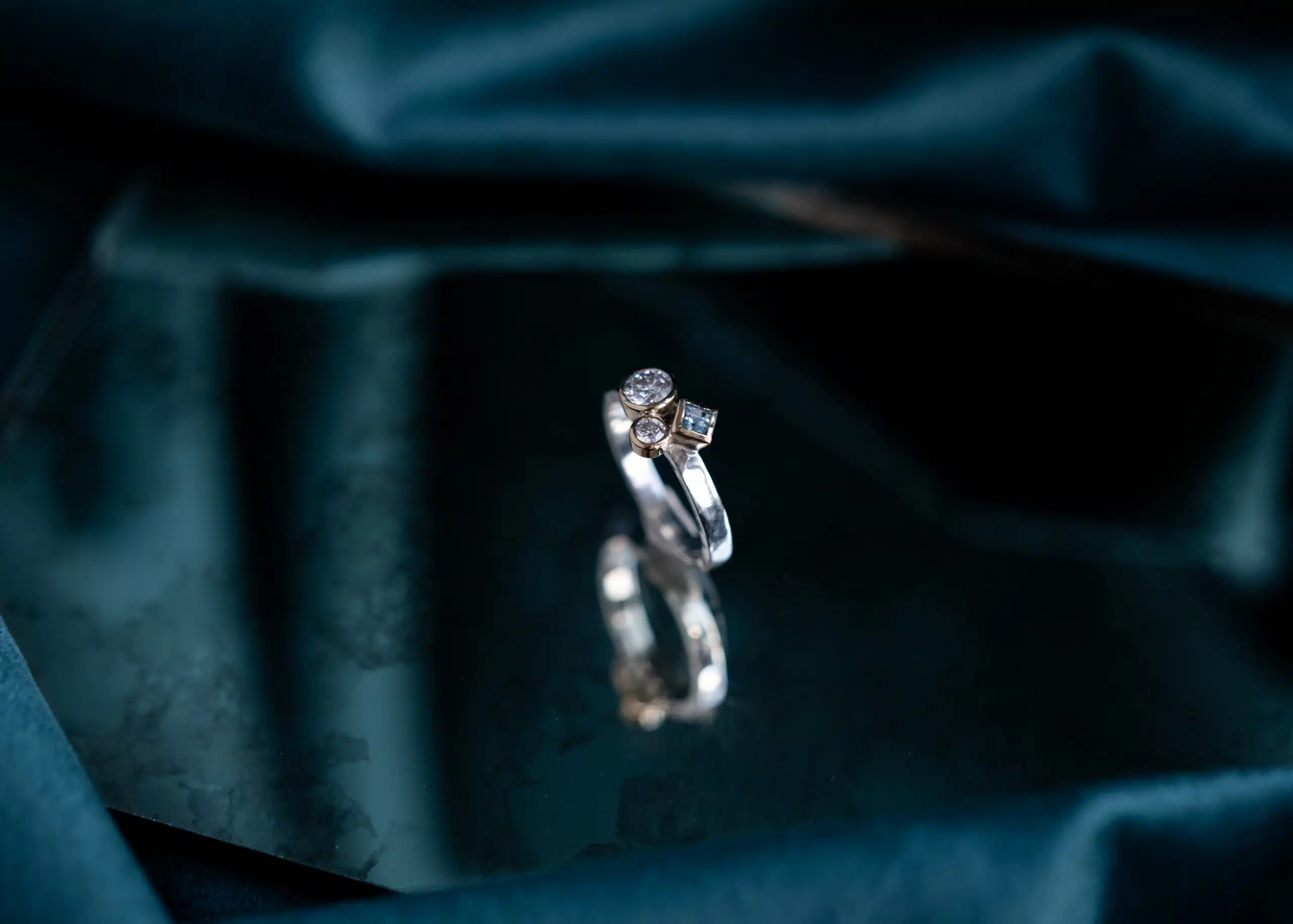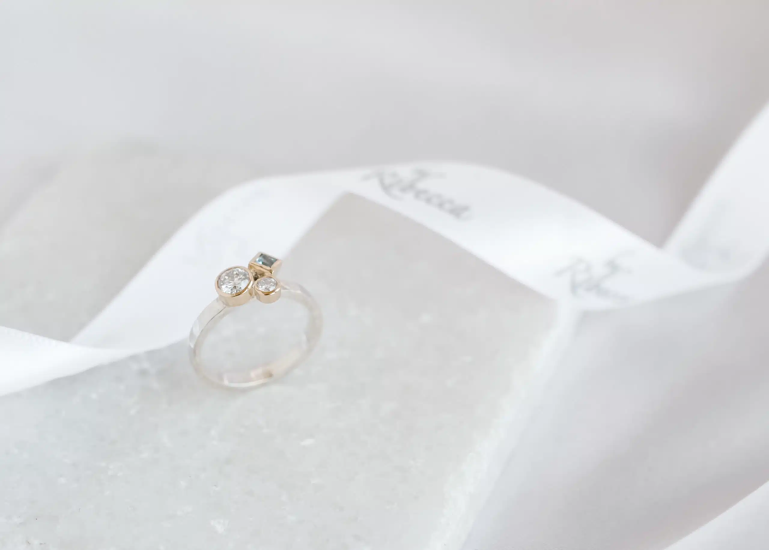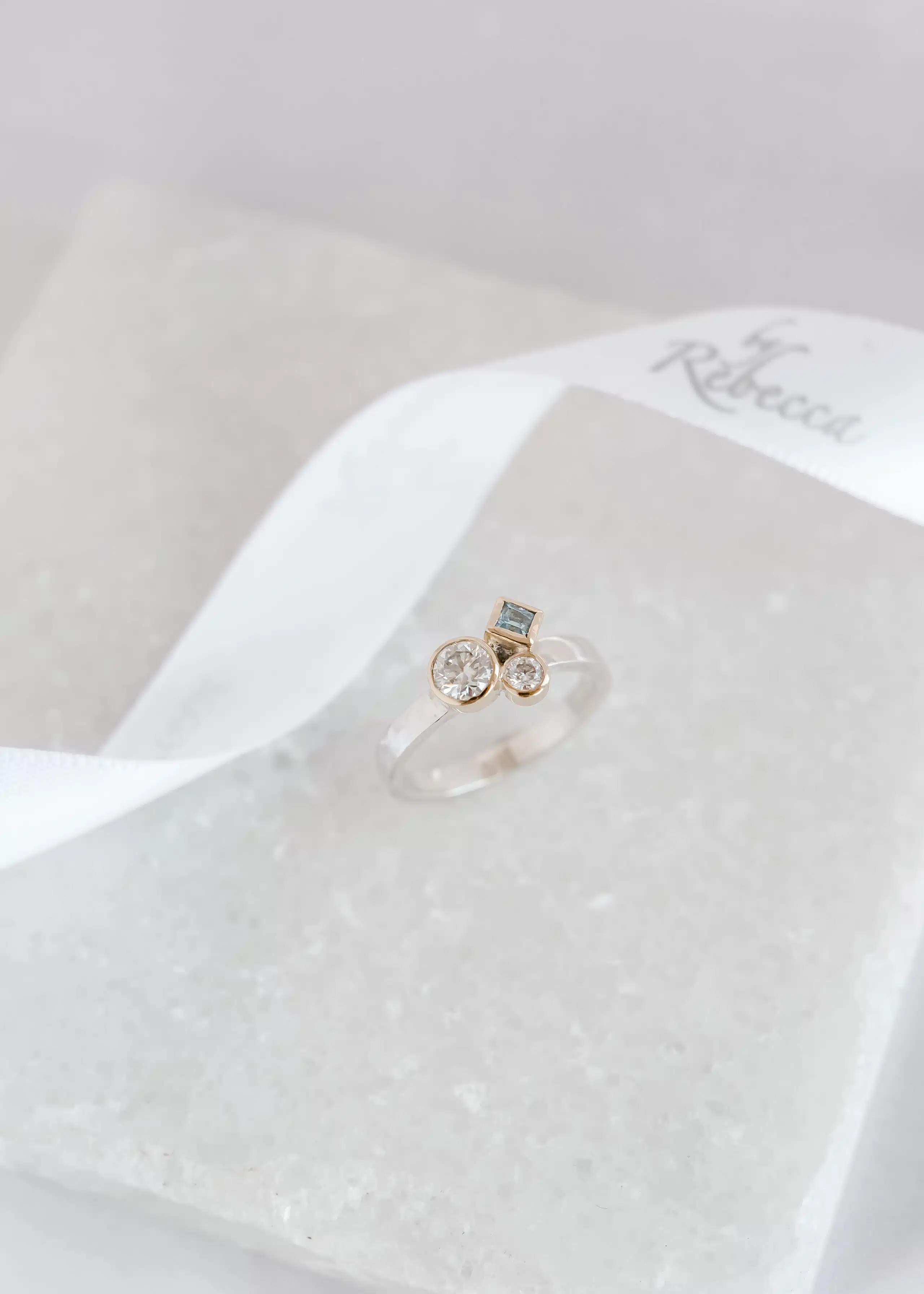 Home > Shop > One of a Kind > The Talia Ring – Sterling Silver Aquamarine and Moissanite Ring set in 9ct Gold