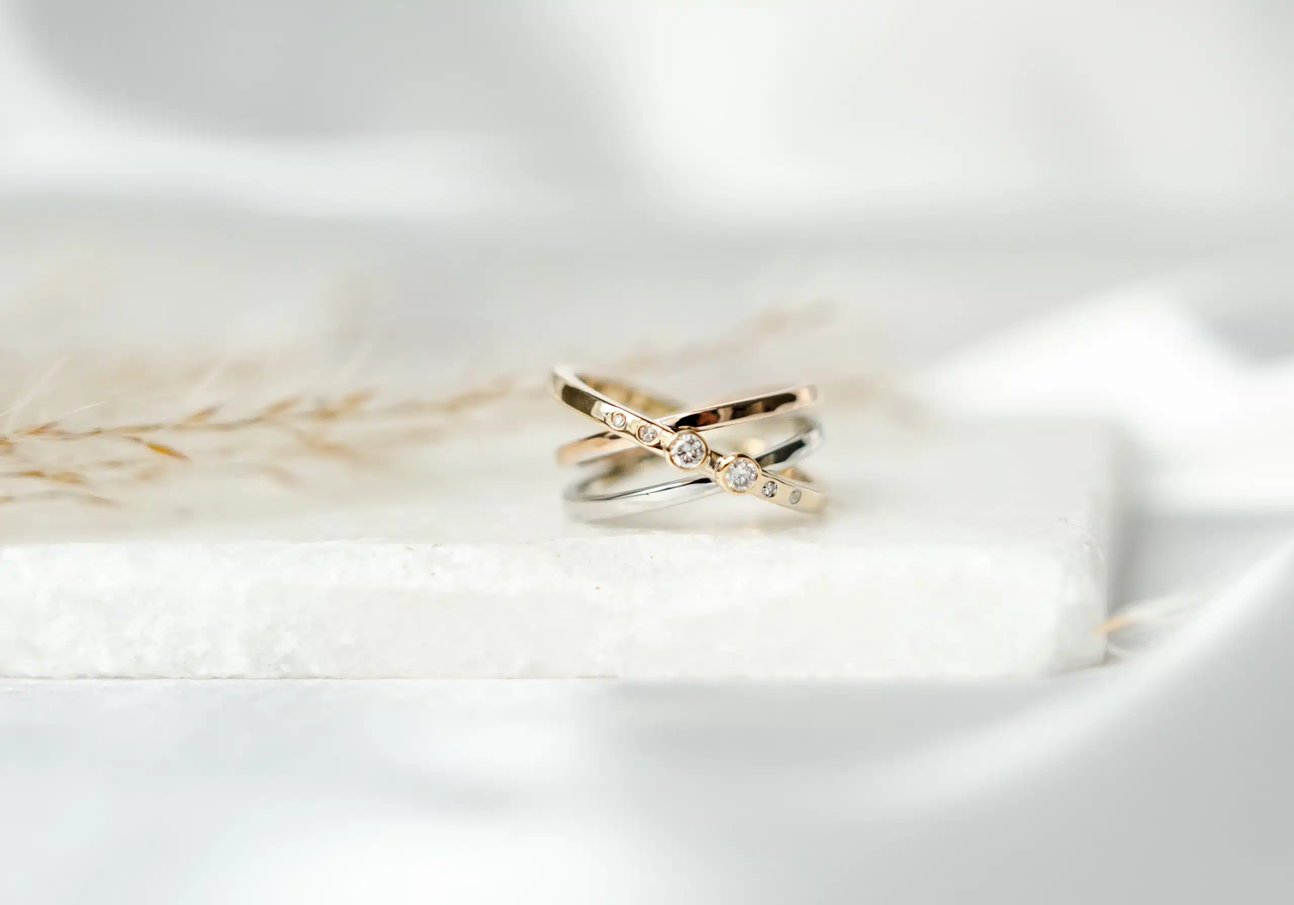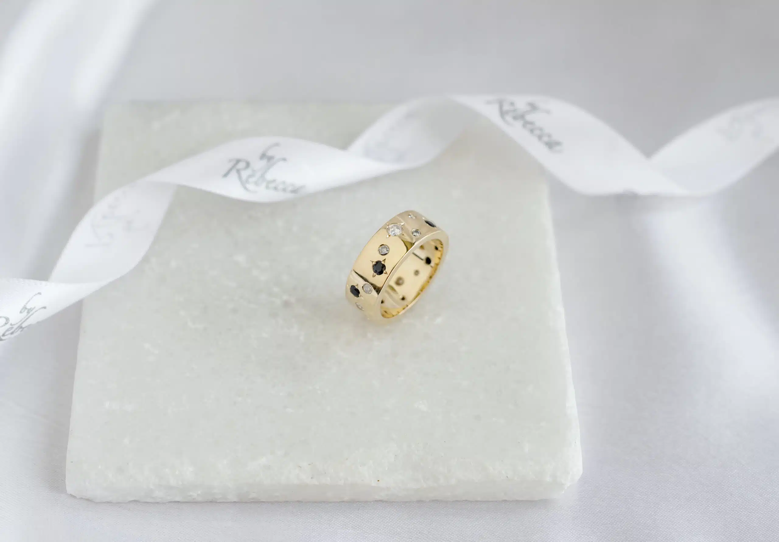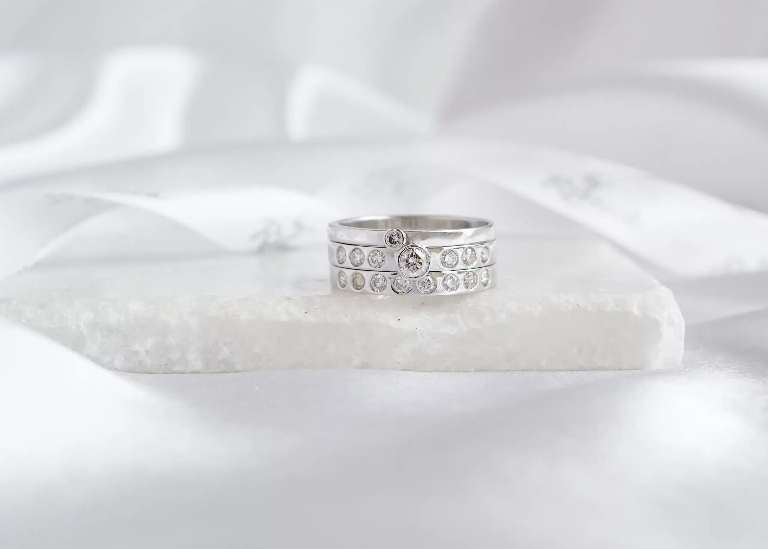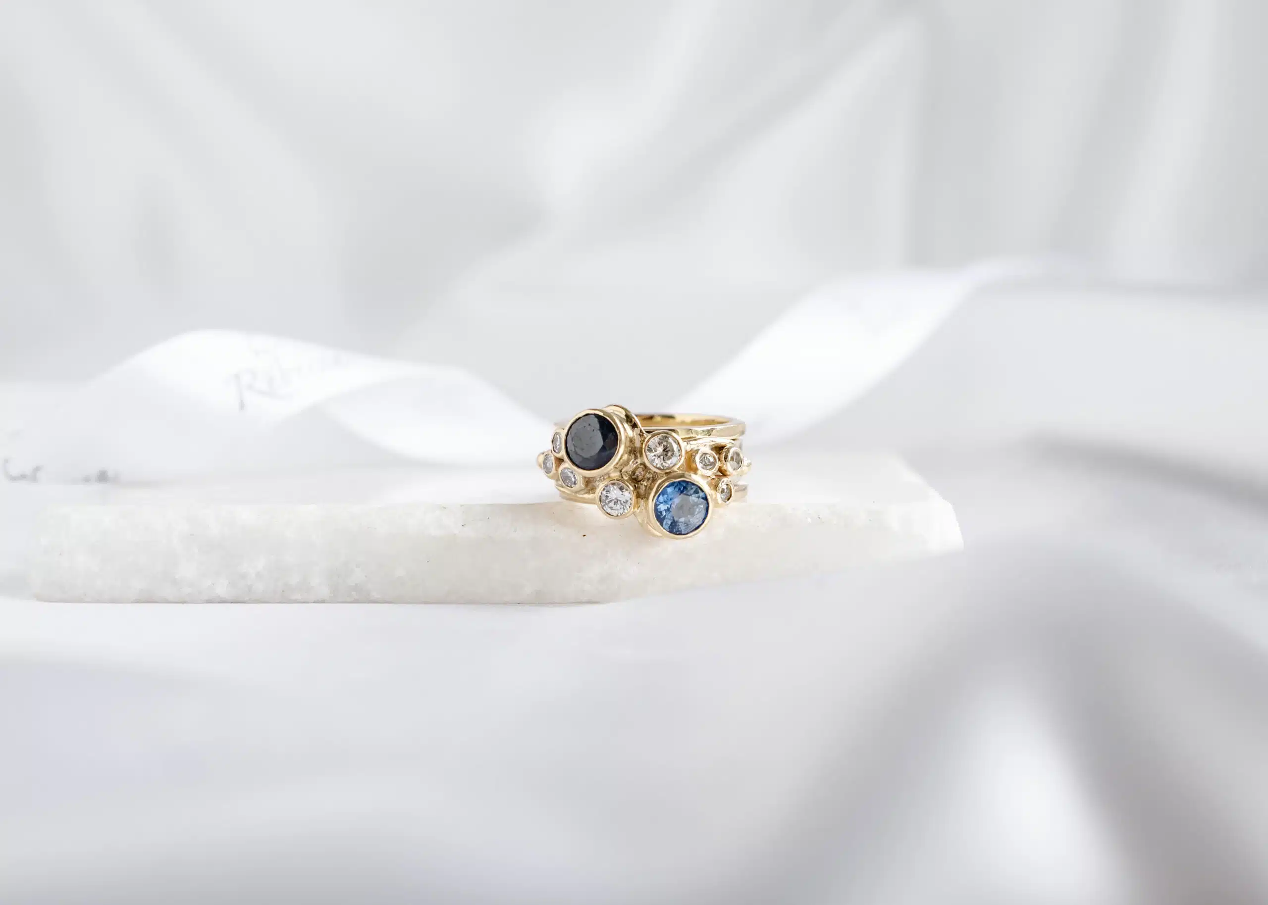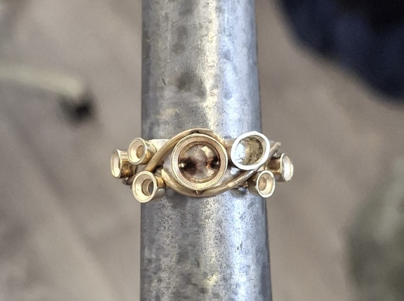 Different types of metal need to be melted in their own groups, but don’t worry — we can still combine 9ct and 18ct gold beautifully within one design (for example, using one for the band and the other for the settings).