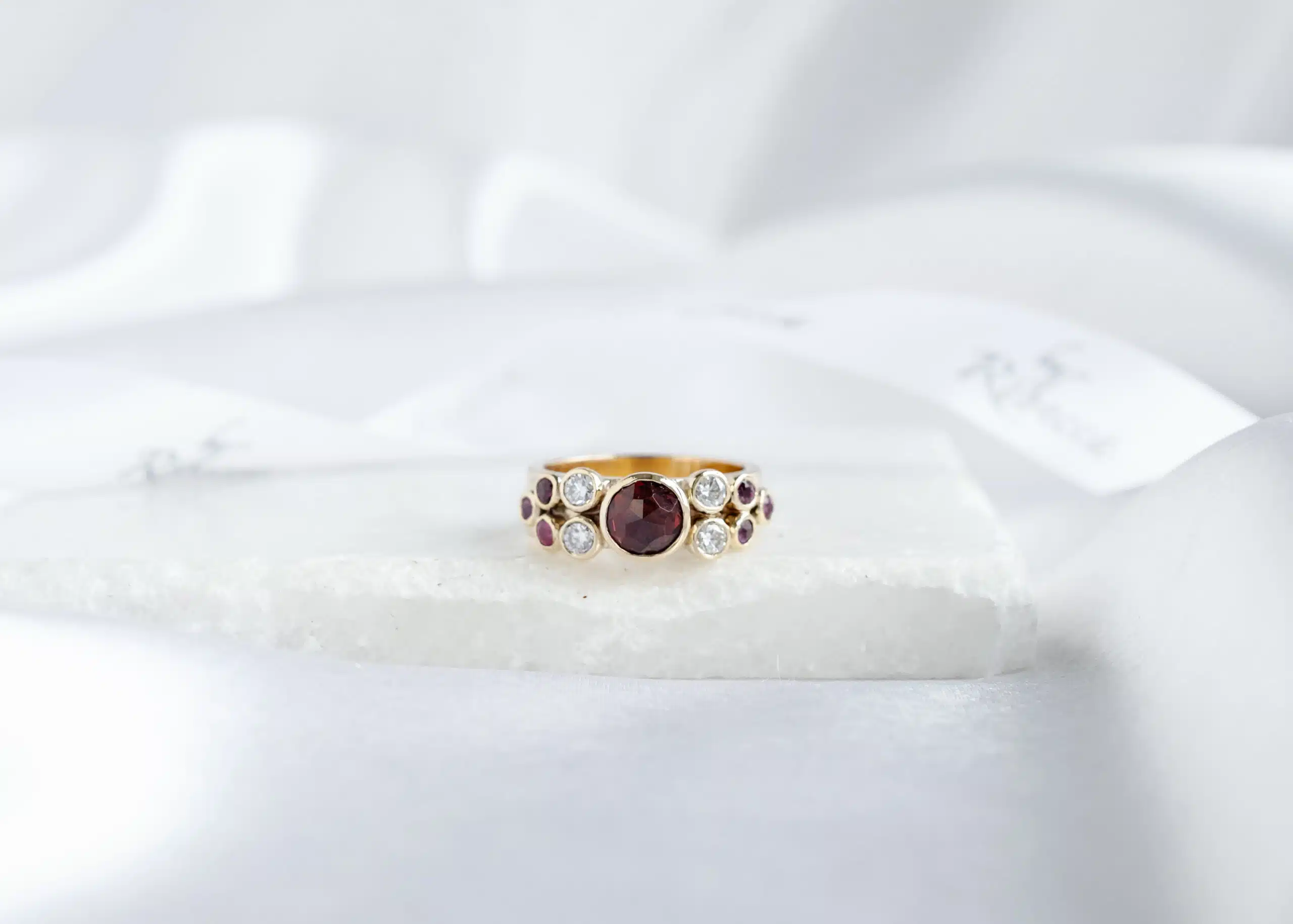 Gold that’s been melted and reformed can sometimes show tiny imperfections, and older stones are often irregular in shape or antique cut. This means that settings, especially flush or pavé, may appear more organic than perfectly machine-made. These details are not flaws—they are the unique character of Reloved jewellery and part of what makes your piece truly one of a kind.