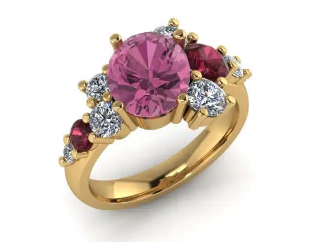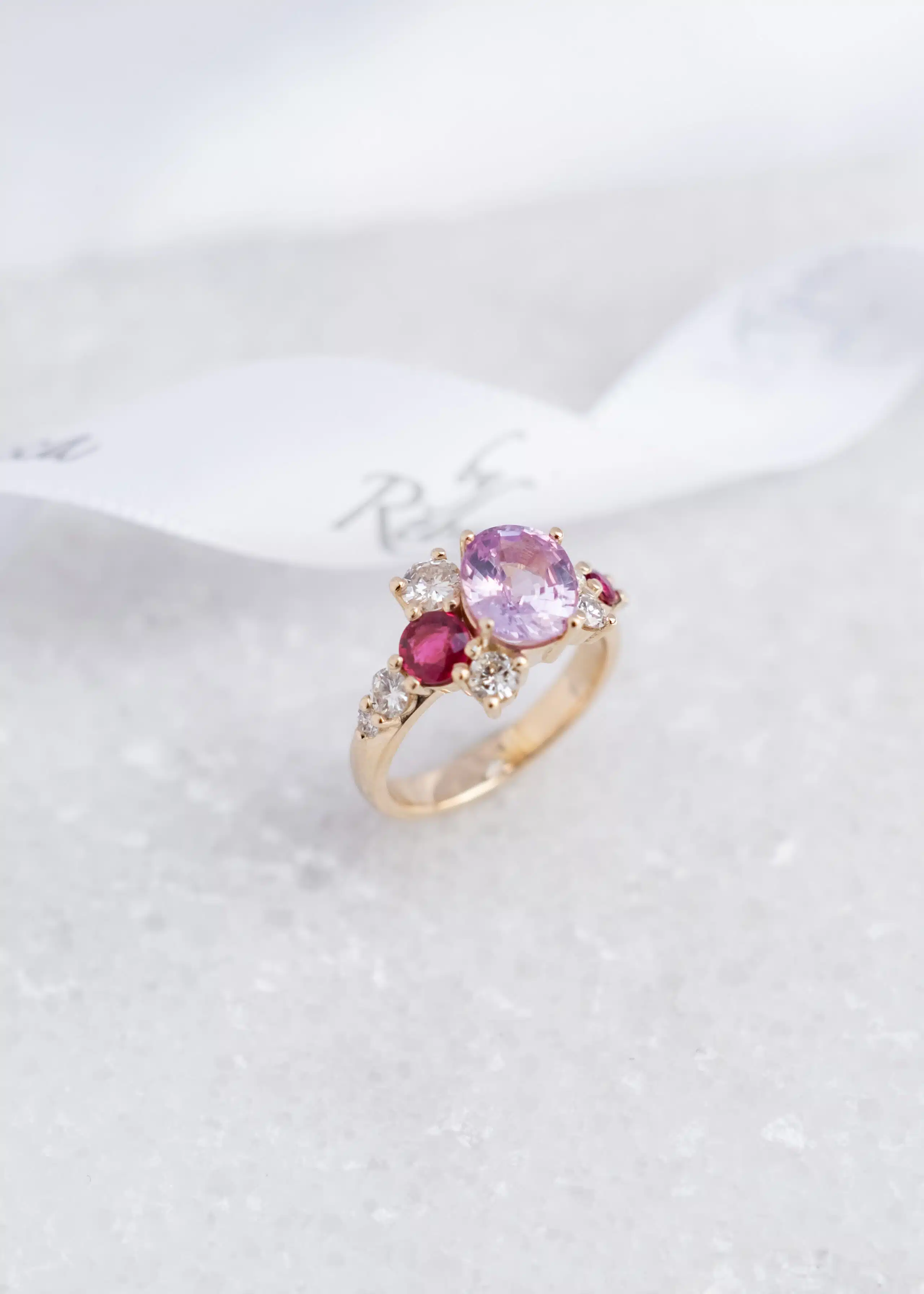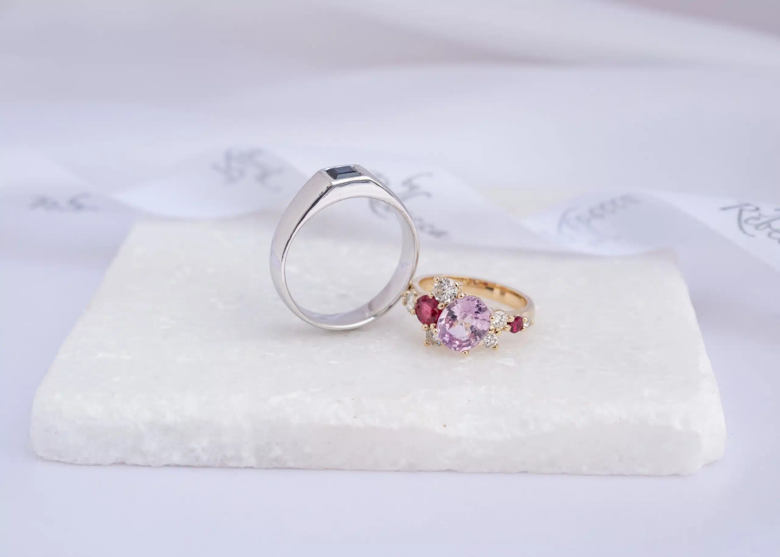 For example, shown in these images, we remodelled Lisas special family diamonds and rubies along with a handpicked stunning new pink sapphire from her soon to be husband Kevin, to add to the design to create a truly bespoke engagement ring bringing together the past, present and now future. We then took the Heirloom Square Sapphire and set that into a new white gold band for Kevin.